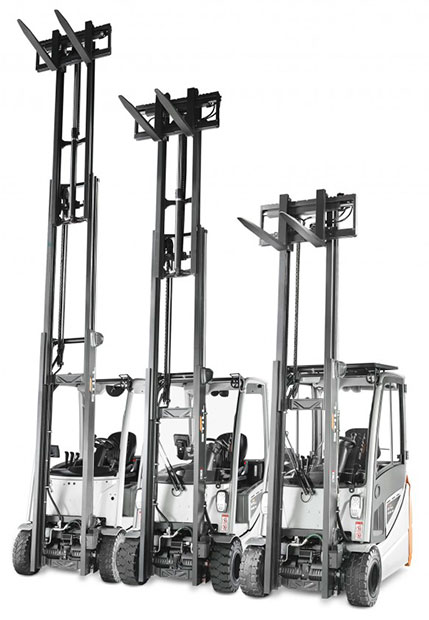 • Triplex – трисекційна щогла з вільним ходом каретки. Дозволяє використовувати весь корисний обсяг складу, заповнюючи стелажі товаром під саму стелю. Також можна використовувати в умовах обмеженої висоти приміщення (наприклад у вагоні або контейнері).